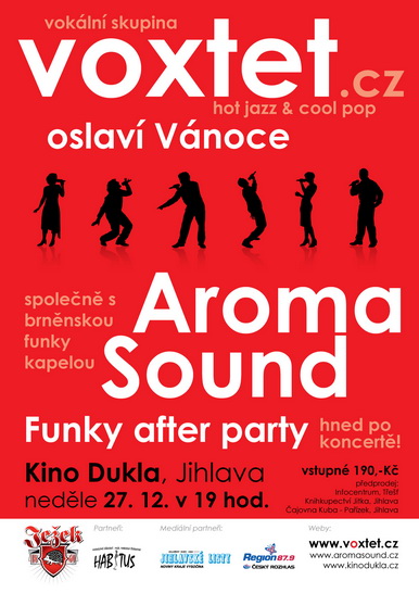 Voxtet oslaví Vánoce společně s brněnskou funky kapelou Aroma Sound. Na koncertě vystoupí obě dvě sopranistky (Sabina Feldmanová i Vladimíra Krčková), co s Voxtetem zpívají zaskakujíce za naší Renču odskočivší si na mateřskou dovolenou :-) Zároveň se vám také poprvé představí vybraní členové Voxtetu ve svých sólových kusech zazpívaných za doprovodu hostující funky kapely. Na závěr jistě dojde i na spolupráci obou souborů... Let's Jam! Po koncertě ale nikam neodcházíme, nýbrž zůstáváme v Kině Dukla na nefalšované funky after party, kde si kromě Piva Ježek vychutnáme i mnoho slavných hitů Stevieho Wondera, Eart Wind and Fire, George Bensona a dalších... Vstupné: 190,- Kč